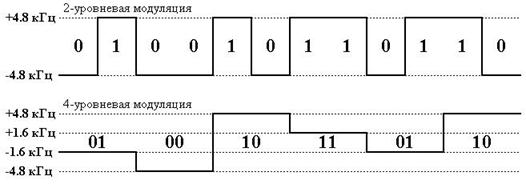 При скорости 1600 бит/сек используется 2-уровневая частотная модуляция. При скорости 3200 бит/сек может использоваться как 2-уровневая, так и 4-уровневая частотная модуляция. При скорости 6400 бит/сек используется 4-уровневая частотная модуляция. Значения девиации для различных двоичных данных при 2-уровневой и 4-уровневой частотной модуляции приведены на диаграмме