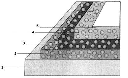 Рисунок. 13.9. Структура паперу, використовуваного для друкування автохромним принтером: 1 - основа; 2 - ціановий шар; 3 - пурпурний шар; 4 - жовтий шар; 5 - захисний теплостійкий шар