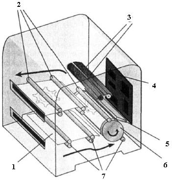 Рисунок 13.11. Основні компоненти автохромного принтера: 1 - папір; 2 - валики; 3 - фіксувальні лампи; 4 - блок керування; 5 - термічна головка; 6 - барабан; 7 - валики