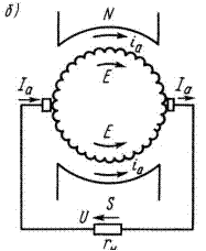 Статор состоит из станины, к которой крепятся главные и добавочные полюса. Главные полюса (ГП) предназначены для создания основного магнитного потока. Они имеют расширенный полюсный наконечник. Для уменьшения потерь на вихревые токи, наконечник главного полюса делают шихтованным. На главных полюсах расположена обмотка возбуждения (ОВ). Обмотка возбуждения бывает двух видов: параллельного и последовательного возбуждения. Обмотка параллельного возбуждения. Подключается параллельно обмотке якоря или к независимому источнику постоянного тока. Ток возбуждения составляет 1-2% от тока якоря, поэтому обмотка выполняется из провода малого сечения, имеет большое число витков и большое сопротивление. Обмотка последовательного возбуждения. Включается последовательно в цепь якоря, т.е. I в= Ia, поэтому обмотка выполняется из провода большого сечения, имеет малое число витков и малое сопротивление. На главном полюсе могут одновременно находиться обмотки параллельного и последовательного возбуждения. Добавочные полюса (ДП) располагаются посередине между главными и предназначены для улучшения коммутации (уменьшения искрения под щетками). Обмотка добавочных плюсов (ОДП) включается последовательно в цепь якоря. Для уменьшения запаздывания магнитного потока добавочный полюс делается полностью шихтованным. В наконечник главного полюса укладывают компенсационную обмотку(КО) предназначенную для компенсации поперечной реакции якоря. КО включается последовательно в цепь якоря, выполняется из провода большого сечения. Якорь МПТ состоит из сердечника якоря, который собирается из листов электротехнической стали, коллектора, обмотки и вала. В пазы сердечника укладывается обмотка якоря, состоящая из отдельных секций. Концы секций припаиваются к коллектору, который выполняет роль электромеханического преобразователя. Коллектор выполняется из медных пластин, изолированных друг от друга слюдой или миканитом. На коллектор устанавливают щетки, через которые происходит подвод или съем напряжения.