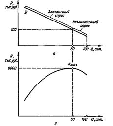 Рис. 25 - Эластичность спроса (а) и изменение валовой выручки (б): Р – цена машины, Q – выпуск машин, R - доход (выручка) фирмы от продажи машин