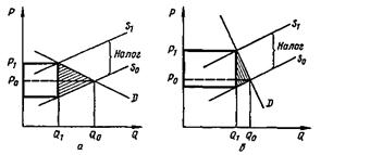 Рис. 27 - Распределение налогового бремени при эластичном (а) и неэластичном (б) предложении: D - спрос, So, S1 - предложение до и после введения налога