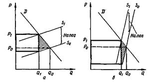 Рис. 26 - Распределение налогового бремени при эластичном (а) и неэластичном (б) спросе: D - спрос, So, S1 - предложение до и после введения налога