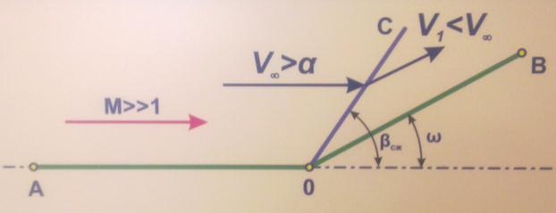Основными особенностями гиперзвуковых течений являются: 1 С увеличением числа Маха (↑M→↓ 2 Малые изменения параметров движения обтекаемого тела приводят к существенным изменениям параметров газа 3 Из-за высоких температур за головной ударной волной и в погранич-ном слое могут иметь место диссоциация и ионизация газа, что приводит к изменению его термодинамических свойств. Таким образом, при гиперзвуковых течениях методы исследования аэро-динамических характеристик применяемых при дозвуковых и умеренных сверхзвуковых скоростях течения газа становятся непригодным. При рассмотрении обтекания тел под небольшим углом атаки Сжатие потока проходит с образованием скачка уплотнения ОС: