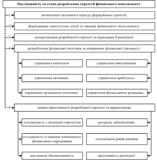 Финансовая стратегия согласовывается с общей стратегиейпредприятия и является фактором обеспечения его эффективного функционирования и финансового развития в будущем. Процесс разработки стратегии финансового менеджмента включает несколько этапов (рис.15.6).