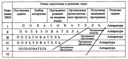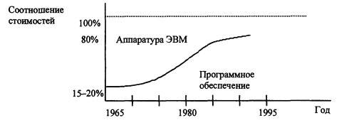 формулировка проблемы и математическая постановка задачи; выбор метода и разработка алгоритма решения; программирование (запись алгоритма) с использованием некоторого алгоритмического языка; планирование и организация вычислительного процесса - порядка и последовательности использования ресурсов ЭВМ и ВС; формирование “машинной программы”, т.е. программы, которую непосредственно будет выполнять ЭВМ; собственно решение задачи - выполнение вычислений по готовой программе. По мере развития вычислительной техники автоматизация этих этапов идет снизу-вверх. В ЭВМ 1-го поколения автоматизации подлежал только последний этап. Все пять предыдущих этапов пользователь должен был готовить вручную самостоятельно. Трудоемкий и рутинный характер этих работ был источником большого количества ошибок в заданиях. Поэтому в ЭВМ следующих поколений появились сначала элементы, а затем целые системы, облегчающие процесс подготовки задач к решению. Для ЭВМ 2-го поколения характерно широкое применение алгоритмических языков (Автокоды, Алгол, Фортран и др.) и соответствующих трансляторов, позволяющих автоматически формировать машинные программы по их описанию на алгоритмическом языке. Здесь же широко стали внедряться библиотеки стандартных программ, что позволило строить машинные программы блоками, используя накопленный и приобретенный программистами опыт. Отметим, что временные границы появления всех нововведений достаточно размыты. Обычно их истоки можно обнаружить в недрах ЭВМ предыдущих поколений. ЭВМ 3-го поколения характеризуются расцветом операционных систем (ОС), отвечающих за организацию и управление вычислительным процессом. Именно здесь слово “ЭВМ” все чаще стало заменяться понятием “вычислительная система”, что в большей степени отражало усложнение как аппаратурной, так и программной частей ЭВМ. Стоимость программного обеспечения стала расти и в настоящее время намного опережает стоимость аппаратурных средств (рис 2).