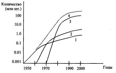 Рис. 3. Структура и динамика развития мирового парка ЭВМ. Классы машин: 1 - большие ЭВМ; 2 - мини-ЭВМ; 3 - персональные ЭВМ; 4 - суммарный парк В настоящее время доля ПЭВМ в мировом парке составляет около 80%. Доли больших ЭВМ и мини-ЭВМ (в последнее время они заменяются средними ЭВМ новых поколений) оцениваются примерно по 10%. Развитие ПЭВМ определяется прежде всего экономическими факторами, так как стоимость единицы вычислительной мощности в них обходится значительно дешевле. Появление ПЭВМ закономерно и объясняется изменением характера вычислительных работ, в которых большую роль играет нечисловая обработка. Большие ЭВМ в основном использовались и используются для централизованной обработки информации. В первую очередь они применялись для крупномасштабных вычислений по программам, разработанным коллективами специалистов. Поэтому дорогие большие машины устанавливались в крупных академических вычислительных центрах. Мини-ЭВМ стали применяться для распределенной обработки данных и для управления объектами, технологическими процессами, предприятиями.