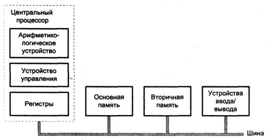Рис. 2. Структура вычислительной машины на базе общей шины В целом, следует признать, что при сохранении фон-неймановской концепции последовательного выполнения команд программы (одна команда в единицу времени) шинная архитектура в чистом ее виде оказывается недостаточно эффективной. Более распространена архитектура с иерархией шин, где помимо магистральной шины имеется еще несколько дополнительных шин. Они могут обеспечивать непосредственную связь между устройствами с наиболее интенсивным обменом, например процессором и кэш-памятью. Другой вариант использования дополнительных шин — объединение однотипных устройств ввода/вывода с последующим выходом с дополнительной шины на магистральную. Все эти меры позволяют снизить нагрузку на общую шину и более эффективно расходовать ее пропускную способность.