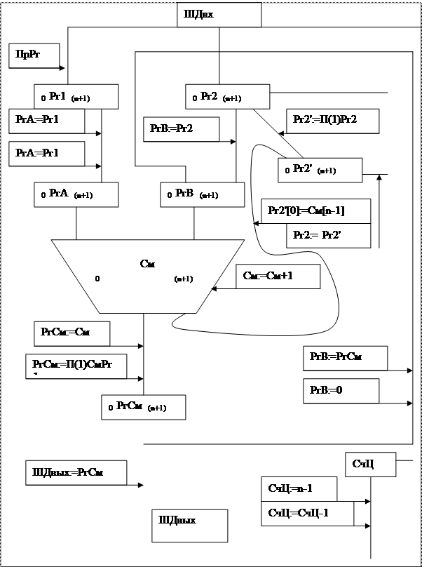 Рг1 для приёма множимого; Рг2 для приёма множителя. Входной РгА сумматора для размещения в нём очередной добавляемой компоненты к сумме частичных произведений. Входной РгБ См используется для размещения текущего значения суммы частичных произведений. Рг2' используется для формирования сдвига множителя вправо по разрядной сетке. Выходной РгСм, в котором формируются текущее значение суммы частичных произведений. Счётчик циклов используется для отображения количества обрабатываемых разрядов множителя. На 1-м этапе выполняется размещение множимого в Рг1. Множимое может передаваться в РгА в прямом или инверсном кодах. На 2-м этапе в Рг2 размещается множитель, поступающий по ШД. Обнуляется содержимое РгВ, используемое вы качестве начального значения суммы частичных произведений. Далее анализируется младшая цифра множителя в Рг2. Если она =1, то в РгА передаётся содержимое Рг1 и на выходе См формируется текущее значение суммы частичных произведений. Одновременно передают множитель для анализа очередной цифры. Для этого его содержимое передаётся в Рг2' с сдвигом вправо на 1 по разрядной сетке. В свободный разряд Рг2' помещается младший разряд со входа См. Остальные разряды См предаются в РгСм со сдвигом вправо на 1 разряд. После этого значение РгСм размещается в РгВ. Содержимое Рг2' размещается в Рг2 и значение СчЦ уменьшается на 1 по отношению к первоначальному значению, равному количеству числовых разрядов. Процесс продолжается для следующей цифры множителя. Когда содержимое СчЦ становится =0, процесс анализа завершается с получением в РгСм старших разрядов и в Рг2 младших разрядов произведения. После этого выполняется ещё 1 цикл с 0 значением РгА для правилного размещения результата в разрядной сетке двойного слова. До сих пор мы полагали, что перемножаем целые неотрицательные числа. Для умножения чисел со знаками, можно отдельно умножать модули чисел, если они записаны в прямом коде, и затем формировать знак результата. Если отрицательные числа представлены в обратном или дополнительном коде, то для взятия модулей используется дополнительная операция, связанная с добавлением 1. Поэтому для умножения чисел со знаками используется практически тот же алгоритм с некоторыми модификациями.