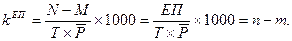 где Теперь рассмотрим формулы, по которым рассчитываются общие коэффициенты естественного движения населения. Вначале введем условные обозначения, используя буквы латинского и русского алфавитов вперемежку (к сожалению, нотация, т. е. обозначение условных знаков в формулах, в демографии пока не стандартизована полностью. Поэтому во всем мире авторы используют ту нотацию, которая кажется им наиболее подходящей). Будем относиться к используемым буквам не как к буквам национального алфавита, а как к совершенно условным знакам. Общий принцип при этом таков: прописными буквами обозначаются абсолютные показатели, строчными буквами — относительные. Отсюда N — число родившихся в расчетный период (обычно это календарный год, но может быть полугодие, квартал, месяц, несколько лет), может быть с верхними и нижними индексами, обозначающими дополнительные сведения (возраст матерей, их брачное состояние и др.); соответственно п — общий коэффициент рождаемости; M — число умерших в расчетный период; т — общий коэффициент смертности; ЕП — естественный прирост, определяемый как разность между числом родившихся и умерших, a kЕП — коэффициент естественного прироста; В (латинское) — число заключенных браков, а b — общий коэффициент брачности; D — число разводов, d — общий коэффициент разводимости. Суффиксы -«мость», -«ность» в словах «рождаемость», «смертность» и т.п. обозначают именно интенсивность данных категорий. Обозначение общей численности населения — Р — нам уже известно. Добавим к этому еще Т — длину расчетного периода в целых годах — и можем теперь записать формулы математически. Общий коэффициент рождаемости: