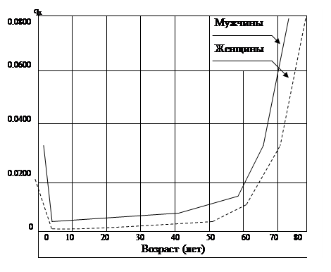 Рис. 6.2. Вероятность умереть qx для мужского и женского населения СССР, 1986—1987 гг.