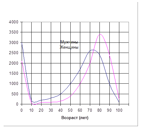 Рис. 6.3. Число умирающих dx мужчин и женщин СССР, На практике обычно мы не располагаем значениями чисел доживающих lx,для более дробных возрастных интервалов, чем год. Поэтому для средних возрастов, в которых число доживающих изменяется почти прямолинейно, число живущих рассчитывается как обычная средняя арифметическая величина из двух чисел доживающих, на начало и конец возрастного интервала, т. е.: