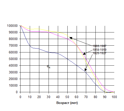 Последовательность изменений чисел доживающих lx графически представляет собой линию дожития, характеризующую порядок вымирания поколения. Чем ниже уровень смертности, чем большая доля родившихся (поколения) доживает до старших возрастов, тем более выпуклой формы будет кривая дожития (см. рис.6.4). Числа живущих. В таблицах смертности числа доживающих показывают долю остающихся в живых к началу каждого следующего года возраста, то есть к возрасту «x» лет остается в живых часть поколения lx, к возрасту «х + 1» — часть lx+1, и т.д. Однако на самом деле при переходе от одного возраста к следующему численность поколения убывает непрерывно, поэтому число живущих в возрасте «х» есть некоторая средняя величина между значениями чисел доживающих lx и lx+1. Если разбить каждый год возраста на предельно малые промежутки времени и с помощью дифференциального исчисления определить средние величины живущих в каждом таком мельчайшем интервале, то изменение чисел живущих определяется путем интегрирования таких средних. В реальности интегрирование заменяется суммированием.