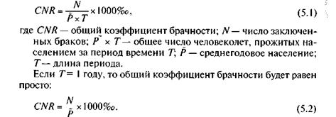К показателям, измеряющим общую частоту вступления в брак, относятся общий и специальный коэффициенты брачности. Общий коэффициент брачности характеризует число браков за год на 1000 человек населения определенного района. Он равен отношению числа заключенных браков к общему числу человеколет, прожитых населением за тот или иной период времени, или к среднему (среднегодовому, если речь идет о годе) населению: