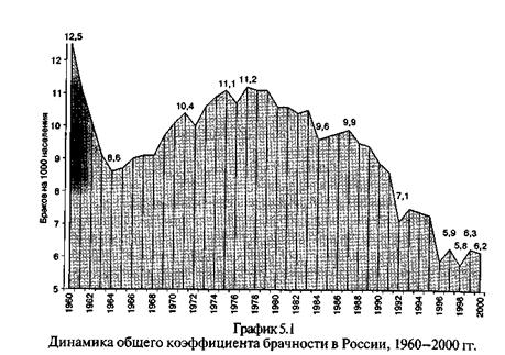 В таблице и на графике в качестве иллюстрации приведены данные об абсолютном числе браков и общем коэффициенте брачности в России за 1960-2001 гг. Обращает на себя внимание неустойчивый характер динамики общих коэффициентов брачности, в котором, однако, однако, обнаруживается долговременная тенденция их снижения. Особенно ярко эта тенденция проявилась в 1990-е гг. Если в 1960-1980 гг. общий коэффициент брачности колебался под влиянием изменений возрастной структуры, связанных с изменениями рождаемости в предшествующие периоды, то в 1990-е гг. этот коэффициент снизился настолько сильно, что его уже невозможно объяснить действием демографических волн. В этот период реально снизилась интенсивность брачности, т.е. изменилось брачное поведение населения, уменьшились желание вступать в зарегистрированный брак. Причины: социально-экономический кризис 1990-х гг., постепенный переход населения России к так называемому европейскому типу брачности, распространение незарегистрированных браков. В 2001 г. отмечено некоторое увеличение абсолютного числа браков и общего коэффициента по сравнению с тем же периодов 2000 г. Однако это увеличение не следует воспринимать как реальный рост брачности. Просто в возраст максимальной брачности стали вступать поколения, родившиеся в первой половине 1980-х гг., когда происходил некоторый подъем числа рождений, связанный с динамикой возрастной структуры населения и некоторым реальным ростом рождаемости, стимулированным принятыми тогда мерами социальной политики, направленными на помощь семьям, имеющим детей. Совсем скоро (уже после 2004 г.) станет ясно, что «подъем брачности» на самом деле является фантомом. Более точное измерение уровня брачности обеспечивают ее специальные коэффициенты. Специальный коэффициент брачности применяется для оценки частоты событий среди бракоспособного населения, отдельно для мужчин и женщин. Рассчитывается он аналогично общему коэффициенту брачности, только в данном случае в знаменателе находится либо численность населения в возрасте 16 лет и старше (бракоспособное), либо численность населения в бракоспособном возрасте, находящегося в определенном брачном состоянии: никогда не состоявшие в браке, разведенные, вдовые. Специальные коэффициенты брачности рассчитываются отдельно для всего населения в бракоспособном возрасте (16 лет и старше), а также для бракоспособного населения (отдельно мужчин и женщин, не состоящих в браке). Кроме того, рассчитывают и специальные коэффициенты брачности для первых браков. Специальный коэффициент брачности для всего населения имеет следующий вид: