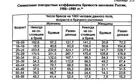 среднегодовая численность мужчин в бракоспособном возрасте, не состоящих в браке (холостых, вдовых и разведенных). Аналогично рассчитываются специальные коэффициенты брачности для женского бракоспособного населения. Точно так же рассчитываются специальные коэффициенты брачности отдельно для каждого брачного статуса, т.е. для тех, кто никогда не состоял в браке (специальные коэффициенты брачности для первых браков) для вдовых и для разведенных. В этом случае в числителе стоит соответственно или число первых браков, или число браков вдовых или разведенных, а в знаменателе - численность мужчин или женщин соответствующего брачного статуса (никогда не состоявших в браке, вдовых или разведенных). Однако данный показатель также нуждается в стандартизации по возрастному составу населения. Поэтому кроме специальных коэффициентов для всех перечисленных выше категорий населения рассчитывают также повозрастные коэффициенты брачности. Последние рассчитываются по отношению или только к бракоспособному населению, или ко всему населению, каждого возраста. В первом случае они называются специальными повозрастными коэффициентами брачности и показывают чистую интенсивность этого процесса в отдельных возрастах. Они равны отношению числа браков, заключенных лицами данного возраста, к среднегодовой численности бракоспособного населения этого возраста. Эти коэффициенты также могут рассчитываться как для всего бракоспособного населения, так и отдельно для мужчин и женщин или для каждого брачного состояния. Чаще всего специальные повозрастные коэффициенты брачности рассчитываются для первых браков, т.е. для холостых (никогда не состоявших в браке), а также для повторных браков (без разделения на вдовых и разведенных). В табл. 5.5 приведены данные о специальных повозрастных коэффициентах брачности мужчин и женщин за 1988-1989 гг. Во втором случае, т.е. когда повозрастные коэффициенты брачности рассчитываются по отношению ко всему населению данного возраста, они называются приведенными числами браков. Их рассчитывают для всех браков, для первых и повторных.