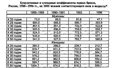 Данные табл. 5.6 служат дополнительной иллюстрацией того факта, что на протяжении 1990-х гг. в России происходил неуклонный процесс снижения брачности как мужчин, так и женщин. В результате на протяжении всего этого периода времени быстро увеличивалась доля лиц, никогда не вступавших в брак к возрасту 50 лет, т.е. доля окончательного безбрачия. Хотя точные данные об этом можно будет получить только в ходе переписи населения 2002 г., тем не менее это является никем не отрицаемым фактом. Подтверждением этого служит хотя бы то, что по данным микропереписи 1994 г. доля окончательного безбрачия среди мужчин по сравнению с переписью 1989 г. выросла с 37 до 55%о, а у женщин - с 35 до 46%о35.