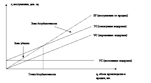 При планировании затрат на предприятии выполняются следующие этапы. 1) Каждое производственное подразделение формирует плановую калькуляцию себестоимости на плановый объём работ по установленной на предприятии экономике и по установленной номенклатуре статей. 2) Плановые калькуляции передаются в плановый отдел предприятия. При этом проводится: - проверка обоснованности плановых калькуляций; - согласование и утверждение плановой калькуляции. 3) Путём суммирования плановых калькуляций структурных подразделений определяется себестоимость валового оборота. 4) Определяется себестоимость внутризаводского оборота и, исходя из этого, устанавливается себестоимость производства валовой продукции. Если на предприятии имеют место значительные отклонения по НЗП, то необходимо также рассчитать себестоимость товарной продукции. Себестоимость валовой или товарной продукции называется калькуляционным сводом. 5) На основании калькуляционного свода составляется смета затрат по экономическим элементам. 6) На основании калькуляционного свода рассчитываются плановые калькуляции по видам выпускаемой продукции. Учитывая тот факт, что при калькулировании полной себестоимости, как правило, невозможно добиться справедливого распределения косвенных затрат между отдельными видами продукции, на предприятиях всё чаще прибегают к альтернативным системам управления затратами, в том числе используются следующие системы: - директ-костинг; - стандарт-костинг; - контроллинг; - другие. Система директ-костинг основана на раздельном учёте прямых и косвенных затрат, при этом для ценообразования используется сумма прямых затрат. Косвенные затраты рассматриваются как элемент финансового результата и покрываются за счёт маржинальной прибыли. Маржинальная прибыль (МП): МП = Вр – Прямые затраты (23) Учитывая, что большинство прямых затрат является условно-переменными, а большинство косвенных затрат являются условно-постоянными, в рамках системы директ-костинг решаются также вопросы оптимизации, объёма и структуры производства и продаж. При этом используются следующие инструменты: - точка безубыточности; - запас финансовой прочности; - операционный рычаг. Под точкой безубыточности понимается объём производства (продаж), при котором предприятие уже покрывает свои издержки за счёт поступления от продаж, но ещё не получает прибыли. Исследование точки безубыточности основывается на сопоставлении трёх категорий: - переменные издержки; - постоянные издержки; - поступления от продаж. Для их исследований используют два типа моделей: 1) нелинейная модель, направленная на изучение долгосрочной перспективы; 2) линейная модель, ориентированная на изучение предприятия в кратко- и среднесрочном периоде. При её рассмотрении закладываются следующие допущения: - объём продаж равен объёму производства; - сумма постоянных издержек неизменна на всем рассматриваемом диапазоне объёмов производства и продаж; - переменные издержки изменяются равномерно и прямо пропорционально; - поступления от продаж также прямо пропорциональны объёмам продаж, при этом каждая единица продукции приносит определённый доход. SP = TC где q – объём продаж; р – цена единицы продукции.