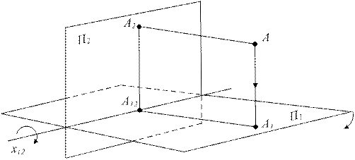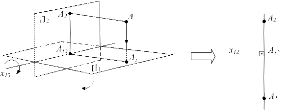 P1 - горизонтальная плоскость проекций; P2 - фронтальная плоскость проекций; x12 - линия пересечения плоскостей проекций, ось чертежа; А - оригинал; А1 - горизонтальная проекция точки А; А2 - фронтальная проекция точки А. Рисунок 1.7