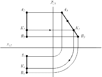 Рисунок 1.11 Хотя объект однозначно определяется двумя проекциями, в некоторых случаях используются трехкартинные эпюры или комплексные чертежи. (Например, при нахождении точки на профильной прямой - прямой, параллельной профильной плоскости проекций).