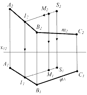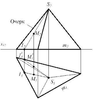 Пирамидальная поверхность задается в пространстве и на чертеже своим определителем Ф (S,m)[ А ], где S - вершина пирамиды; m – направляющая, ломаная линия. Пирамидальная поверхность располагается по обе стороны от ее вершины, может быть замкнутой и незамкнутой. М – произвольная точка, принадлежащая поверхности пирамиды. Образующая l проходит через т. М, вершину S и пересекает направляющую m.