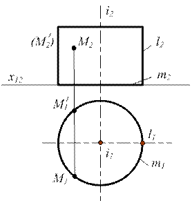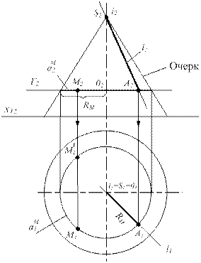Рисунок 3.9 Коническая поверхность вращения - линейчатая поверхность, образованная вращением прямой (образующей) вокруг оси, пересекающей образующую в фиксированной точке (вершине конической поверхности). Коническая поверхность вращения в пространстве и на чертеже задается своим определителем Ф (i, l)[ A ], где i ^ P1 - ось вращения; l - образующая; l Ç i = S - вершина; M Î Ф, M Î aM; aM - окружность вращения т. М; RM - радиус окружности вращения т. М, RM = | O1A1 |; M2 Þ M1 (M′1)