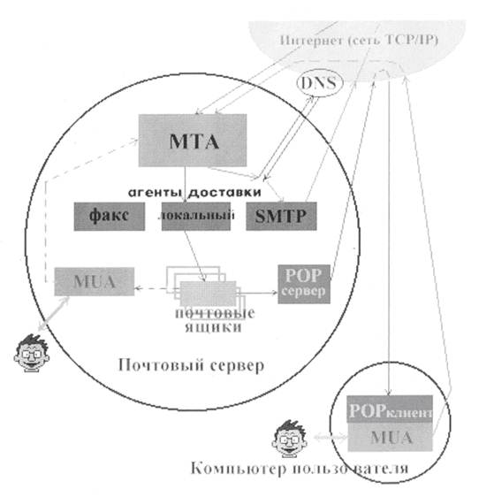На рис. 1 представлена схема строения сети Internet. В ее основе заложен хребет – суперкомпьютеры, соединенные между собой высокоскоростными узлами связи. В дальнейшем по постоянной линии связи информация передается провайдерам – поставщикам Internet обычным пользователям. Обычно пользователи получают доступ к сети Internet посредством телефонной линии. Однако уже сегодня многие провайдеры предлагают услуги RadioInternet – связь между пользователем и провайдером, информация в которой передается посредством спутниковых каналов связи. Это позволяет существенно увеличить скорость и надежность связи, однако на порядок увеличивает стоимость услуги. Сеть Интернет ориентирована на конечного пользователя, как на компьютерного специалиста, так и на рядового гражданина. В сети есть всё, что требуется для нормальной комфортной жизни, равно как и для профессиональной деятельности любого из нас. Журналист найдет в Интернете самые свежие новости, научный работник – материалы последних исследований по интересующей его проблеме, коммерсант узнает котировки валют на любой бирже мира. Желаете забронировать авиабилет или номер в гостинице любого города Европы или Америки – можно; хотите выбрать, купить и поручить вручить подарок вашим знакомым – пожалуйста; есть желание принять участие в обсуждении какой-либо животрепещущей проблемы – как говориться нет проблем.