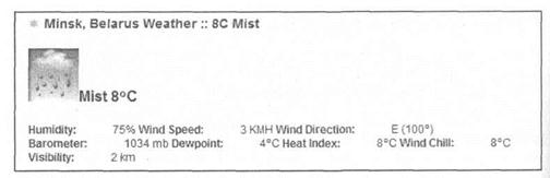 Это сервис от Yahoo, который показывает текущее состояние и прогноз погоды. По адресу http://weather.yahoo.com/ необходимо выполнить поиск города и затем получить ленту RSS. Пример вывода на рис. 5.10. Существует еще альтернативный независимый англоязычный сайт http://www.rssweather.com. Присутствуют основные города, в том числе стран СНГ. Возможна настройка параметров выводимой информации. Авторы сайта предупреждают, что запрос к RSS должен быть не чаще 1 раза в час, нарушители могут лишиться доступа к информации. Внешний вид примера текущего состояния погоды показан на рис. 5.11.