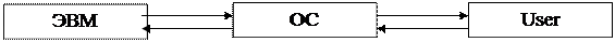 ПО является необходимой составной частью любой ЭВМ. Без соответствующих программ практически невозможно заставить машину сделать что-нибудь полезное. Таким образом, ПО называется комплекс программ, обслуживающих взаимодействие блоков ЭВМ. В настоящее время для разных типов ПЭВМ разработано несколько десятков тысяч программ, которые могут быть разделены на следующие классы: - операционные системы (ОС) и сервисные программы (утилиты); - системы программирования; - прикладные системы. ОС – комплекс программ для управления работой аппаратной части ЭВМ и организации взаимодействия пользователя с ЭВМ. ОС дополняет аппаратные средства любой ЭВМ, позволяя прикладным программам обращаться к внешним устройствам, а пользователю – управлять работой машины с помощью соответствующих команд. Итак, ОС является посредником между ЭВМ и пользователем. Схематично изобразим это так: