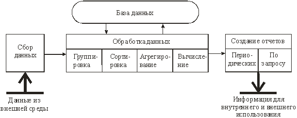 · 1-й уровень - этапы, где реализуются сравнительно длительные технологические процессы, состоящие из операций и действий последующих уровней. · 2-й уровень - операции, в результате выполнения которых будет создан конкретный объект в выбранной на 1-м уровне программной среде. · 3-й уровень - действия - совокупность стандартных для каждой программной среды приемов работы, приводящих к выполнению поставленной в соответствующей операции цели. Каждое действие изменяет содержание экрана. · 4-й уровень - элементарные операции по управлению мышью и клавиатурой. ИНФОРМАЦИОННАЯ ТЕХНОЛОГИЯ ОБРАБОТКИ ДАННЫХ Предназначена для решения хорошо структурированных задач, по которым имеются необходимые входные данные и известны алгоритмы и другие стандартные процедуры их обработки. На уровне операционной деятельности решаются следующие задачи: · обработка данных об операциях, производимых фирмой; · создание периодических контрольных отчетов о состоянии дел в фирме (например, ежедневный отчет о поступлениях и выдачах наличных средств банком); · получение ответов на всевозможные текущие запросы и оформление их в виде бумажных документов или отчетов (например, запрос к базе данных по кадрам). Основные компоненты информационной технологии обработки данных