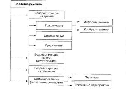 Средство рекламы — прием воплощения идеи рекламного обращения, опирающийся на определенные органы чувств рекламной аудитории (зрение, слух, обоняние). Разновидности средств рекламы приведены на рис.