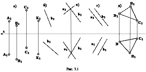 Задание плоскости ПЛОСКОСТЬ Плоскость на комплексном чертеже можно задать: · тремя точками, не лежащими на одной прямой (рис. 5.1, а); · прямой и не принадлежащей ей точкой (рис. 5.1, б); · двумя пересекающимися прямыми (рис. 5.1, в); · двумя параллельными прямыми (рис. 5.1, г); · любой плоской фигурой (рис. 5.1, д); · следами (рис.5.2)