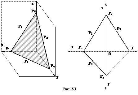 Каждый из следов плоскости совпадает со своей одноименной проекцией, остальные проекции оказываются лежащими на осях координат. Например, горизонтальный след плоскости Р (рис. 5.2) совпадает со своей горизонтальной проекцией Р1, фронтальная его проекция находится на оси x, а профильная на оси у. По расположению следов плоскости можно судить о положении данной плоскости в пространстве.