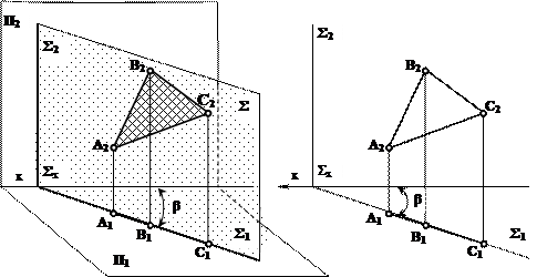 Положение плоскости относительно Любая произвольно взятая в пространстве плоскость может занимать общее или частное положение. Плоскостью общего положения называется плоскость, которая не перпендикулярна и не параллельна ни к одной из плоскостей проекций (см. рис. 5.2). Все остальные плоскости относятся к плоскостям частного положения и подразделяются на проецирующие плоскости и плоскости уровня. Проецирующей называется плоскость, перпендикулярная к одной из плоскостей проекций. Например, горизонтально-проецирующая плоскость