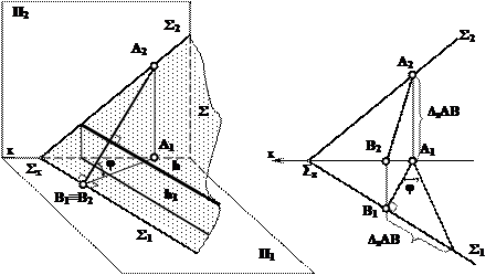 Плоскость общего положения наклонена к плоскостям проекций. Для определения величины угла наклона заданной плоскости к какой-либо плоскости проекции используются линии наибольшего наклона плоскости к плоскости проекций: к П1 - линия ската, к плоскости проекций П2 - линия наибольшего наклона плоскости к плоскости П2. Линии наибольшего наклона плоскости - это прямые, образующие с плоскостью проекций наибольший угол, проводятся в плоскости перпендикулярно к соответствующим линиям уровня. Линии наибольшего наклона и ее соответствующая проекция образуют линейный угол, которым измеряется величина двухгранного угла, между данной плоскостью и плоскостью проекций (рис. 5.10).