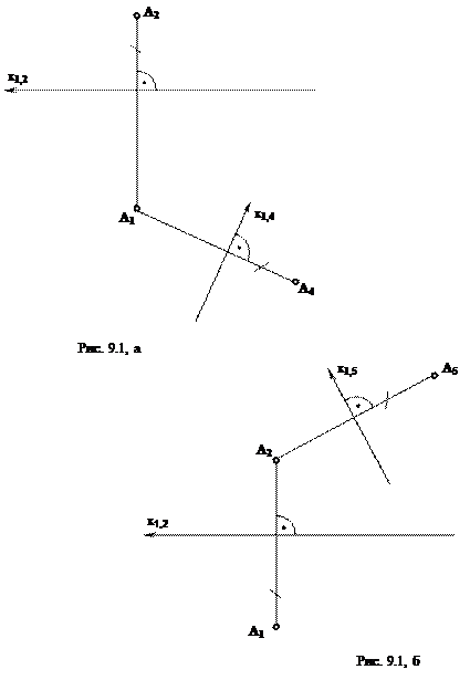 Суть метода заключается в замене одной плоскости проекции на другую. При этом сам объект четко зафиксирован в пространстве. При такой замене величина координаты любой точки на вводимой плоскости будет такой же, как координаты той же точки на заменяемой плоскости. Индексы при обозначении плоскости меняются с заменой самой плоскости проекций (четный индекс - на ближайшую четную На комплексном чертеже преобразование выглядит следующим образом: например, если заменить фронтальную плоскость проекций П2 на новую плоскость П4 (рис. 9.1, а), то последняя должна быть перпендикулярна к плоскости П1 а расстояние от проекции точки A4 до оси x1, 4 будет равно расстоянию от проекции точки А2 до оси х1,2. Новая ось проекции x1, 4 проводится так, как этого требует решение задачи. В рассматриваемом случае она проведена произвольно. При замене горизонтальной плоскости П1 на новую плоскость П5 (рис. 9.1, б) сохраняется неизменная координата Δу. При решении конкретной задачи таких замен может быть выполнено последовательно несколько (как правило, не более двух). Главные условия этих действий — сохранение ортогонального проецирования в новой системе плоскостей проекций и величин соответствующих координат. Линии проекционной связи всегда должны быть перпендикулярны к оси координат, как в первоначальной, так и в новой системе плоскостей проекций.