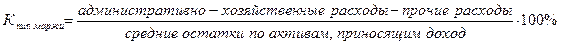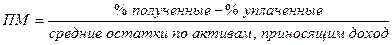 Чем меньше значение этого коэффициента, тем больше возможности у банка увеличить доход, тем выше конкурентная способность банка. Низкая маржа может указать на тот факт, что банк привлекает дорогие депозиты, участвует в операциях с низкой доходностью и невысоким риском. И напротив, если маржа повышенная, то это может быть следствием либо высокого уровня дешевых депозитов, либо вовлечениями активов в высокоприбыльные рисковые операции. Процентная маржа (ПМ) может быть рассчитана следующим образом: