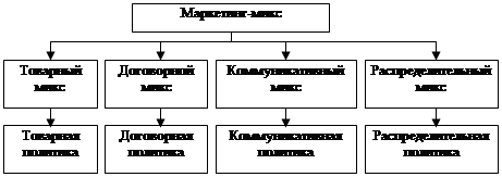 Оптимальный маркетинг-микс представляет собой такую комбинацию маркетинговых инструментов, благодаря которой обеспечивается достижение поставленных целей при рациональном расходовании имеющихся средств бюджета маркетинга. Маркетинг-микс отвечает на вопрос, как можно, благодаря планированию, координации и контролю всех ориентированных на рынок мероприятий обеспечить длительное удовлетворение потребностей покупателей и долгосрочные цели предприятия. Знание процесса разработки маркетинг-микса, его структуры имеет практическое значение. Количество составляющих маркетинг-микса при этом не обязательно должно соответствовать количеству составляющих комплекса маркетинга. Например, для предложенного выше комплекса маркетинга (имеется ввиду его ориентация для России), отдельного субмикса по концепции нет необходимости вводить, то, как этот элемент отражает общую установку, если хотите, культуру руководства предприятия, уровень развития предпринимательской структуры и осознание важности долгосрочного развития. То же относится и к такой составляющей, как люди. Система маркетинг-микса наилучшим образом исследована и представлена в публикациях руководителя школы Санкт-Петербургского университета экономики и финансов Багиева Г.Л. [3]. Он отмечает, что в наиболее часто употребляемой форме маркетинг-микс включает четыре субмикса маркетинга. Это — товарный микс; договорный микс; коммуникативный микс; распределительный микс (рис. 8).