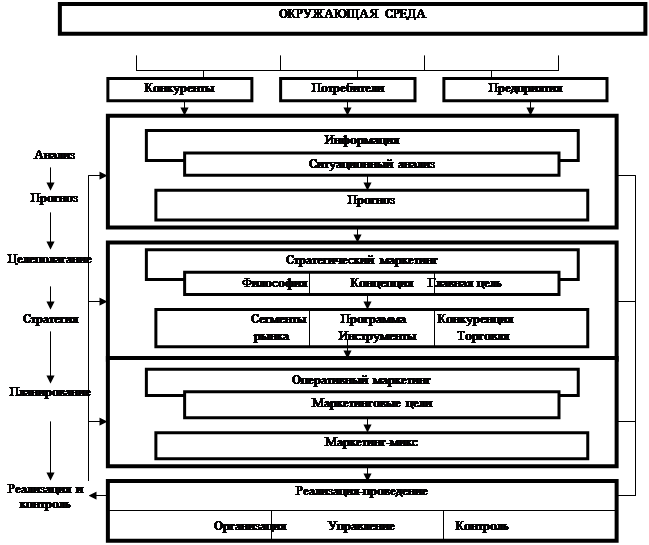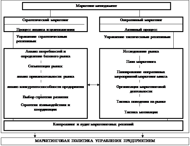 Рис. 9. Процесс маркетинга-менеджмента На этапе анализа исследуются возможные стратегические и тактические проблемы поведения элементов маркетинговой системы: окружающая среда, покупатель, конкуренты, торговля. Результатом анализа должны стать сильные и слабые стороны предприятия в сложившейся ситуации на рынке, то есть необходимо получить ответ на вопрос: где мы находимся? Этап прогнозирования предполагает рассмотрение относительных маркетинговых факторов для обнаружения шансов предприятия в будущем. При этом исследуются тенденции в поведении покупателей и конкурентов, а также развитие рынка и сбыта в условиях предполагаемой окружающей среды. Таким образом, на этом этапе следует дать ответ на вопрос: как будет происходить развитие рыночных отношений? На этапе стратегического маркетинга обосновываются долгосрочные цели и стратегии предприятия и маркетинга. При этом обращается внимание на размеры рынка и выбор рыночных сегментов. Рассматриваются вопросы разработки программ и инструментов маркетинга, а также способы поведения предприятия с конкурентами и торговыми организациями. На этом этапе прорабатывается концепция поведения предприятия на рынке, то есть формируется ответ на вопрос: чего мы хотим достичь? Маркетинговые мероприятия в рамках краткосрочных, тактических маркетинговых решений разрабатываются на этапе оперативного планирования маркетинга. Учитывая цели тактического поведения предприятия на рынке, разрабатывают маркетинг-микс; Тем самым отвечают на вопрос: какие мероприятия необходимо выбрать из возможной вариации ингредиентов рецепта маркетинга-микса? На этапе реализации стратегий и мероприятий маркетинга-микса рассматриваются соображения относительно эффективности процесса организации, концепции управления и контроля за осуществлением стратегий. На этом этапе должны быть решены вопросы: достигнуты ли цели фирмы? Какие мероприятия необходимы для адаптации спроса и предложения? Как видим, маркетинг-менеджмент формирует комплекс долгосрочных и краткосрочных (оперативных) управленческих воздействий (решений) на все подразделения и лица, взаимодействующие в сфере маркетинга, а осуществление воздействий обеспечивает интенсификацию маркетинговых усилий по достижению целей маркетинга и тем самым запланированных результатов деятельности предприятия. То есть, маркетинговая политика предприятия имеет две взаимосвязанные стороны: стратегический маркетинг и операционный маркетинг. Стратегический маркетинг представляет собой постоянный и систематический анализ потребностей рынка. С точки зрения маркетинга покупатель не столько нуждается в товаре, сколько желает решения проблемы, которое может обеспечить товар. Решение может быть обретено с помощью различных технологий, которые сами по себе непрерывно меняются. Роль стратегического маркетинга – прослеживать эволюцию рынка и выявлять на основе анализа потребностей, нуждающихся в удовлетворении, различные существующие либо потенциальные рынки. Для решения этой проблемы разрабатываются цели, концепция и философия предпринимательской деятельности, позволяющие предприятию обслуживать выбранные группы покупателей лучше, чем конкуренты. Оперативный маркетинг – это активный процесс с краткосрочным горизонтом планирования