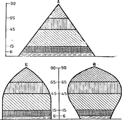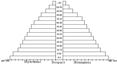 Рис. 4.1. Половозрастная пирамида Существуют 3 типа половозрастных пирамид (по Ф. Бургдёрферу) (рис. 4.2) [10]: А. Прогрессивный тип пирамиды. Имеет форму правильного треугольника и соответствует прогрессивному типу возрастной структуры населения. Б. Стационарный тип пирамиды. Форма колокола. Соответствует стационарному типу возрастной структуры населения. В. Регрессивный тип пирамиды. Форма урны. Соответствует регрессивному типу возрастной структуры населения.