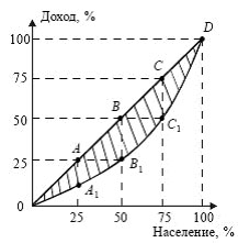 Кривая Лоренца Люди различаются по своему положению в обществе – значит, доходы их различны. Чтобы отследить характер распределения доходов в обществе, используют различные методы: · определение различными статистическими приемами среднего уровня дохода (среднеарифметический, медианный, модальный доход); · группировка населения по уровню дохода и сопоставление средних уровней крайних групп между собой; · построение кривой Лоренца, характеризующей неравенство в обществе через действие кумулятивного (нарастающего) эффекта (рис. 33.1).