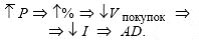 2. Повышение общего уровня цен (P) ведет к росту процентной ставки (%), которая снижает покупательную способность (покупок) и сокращает инвестиционную активность предпринимателей (I). В итоге совокупный спрос снижается (AD). 3. Эффект богатства (кассовых остатков)