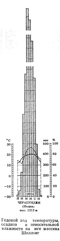 Годовой ход температуры, осадков и относительной влажности на юге массива Шиллонг