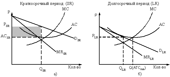 Рис. 15.1. Выбор оптимального объема На рис. 15.1, в части а, отражена кривая спроса для фирмы DSR, кривая рыночного спроса имеет более крутой наклон. Максимизирующий прибыль объем производства QSR определяется пересечением кривых предельного дохода и предельных издержек (MR=MC). Цену РSR, соответствующую оптимальному объему, производства отражает кривая спроса DSR;так как данная цена превышает средние издержки, фирма зарабатывает прибыль, равную (РSR – АСSR) * QSR. Если же цена меньше средних издержек, то это означает, что перед фирмой стоит задача не максимизации прибыли, а минимизации убытков. В этом случае при принятии решения производить или нет, фирма должна сравнить цену продукции РSR со средними переменными издержками АVСSR. Если цена больше средних переменных издержек, то производить следует, так как цена покрывает не только средние переменные издержки, но и часть постоянных. Если же цена меньше средних переменных издержек, то это означает, что необходимо приостановить производство или закрыть фирму. На долговременном этапе получение экономической прибыли будет стимулировать вступление на рынок других фирм. Это приведет к следующему: Этот процесс будет продолжаться до тех пор, пока не останется экономических прибылей, привлекающих новые фирмы. Долговременная кривая спроса DLR будет соприкасаться с кривой средних издержек (рис.15.1,б). В результате в длительном периоде создается ситуация, присущая совершенно конкурентной фирме: ни прибыли, ни убытков (экономическая прибыль равна нулю). Наилучший объем для фирмы определяется MR=MC, при Р>ATCmin.