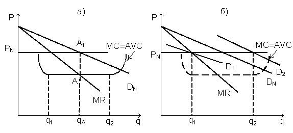 Рис. 16.2. Неизменность цен при варьировании спроса Так как любая фирма максимизирует свою прибыль при MR = MC, а кривые AVC и МС совпадают, то соответствующие значения цены и объема определяются пересечением кривых MR и MC=AVC (А'А). Цена РN – «нормальная» цена. Она берется за основу и в случае изменений спроса (кривые D1и D2на рис. 16.2) не меняется, а объемы продукции уменьшаются (до q1)или увеличиваются (до q2). Следует иметь в виду, что удержание цен целесообразно, если в определенных рамках объема выпуска удается сохранять неизменными средние переменные издержки. Когда фирма имеет классическую U-образную кривую AVC, попытки удержать цену и сократить объем производства (при падении спроса) приведут к потерям. Чтобы описать действия фирмы-олигополиста в долгосрочном периоде, необходимо знать ответную реакцию конкурентов на возможное изменение цен олигополистом. Поскольку их действия не поддаются детерминированию, создать единую теорию поведения фирмы-олигополиста в долгосрочном периоде пока не удается.