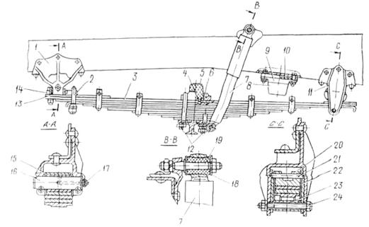 Рис. 4 - Передня підвіска: 1 - передній кронштейн; 2 - драбина вушка, 3 - ресора, 4 – фіксатор накладки; 5 - буфер ресори; 6 - накладка; 7 -амортизатор; 8 - буфер; 9-обойма; 10 -проставка, 11 - задній кронштейн; 12 - драбина, 13 - прокладка вушка ресори; 14 - вушко ресори;15 - втулка вушка; 16 - палець ресори, 17 -маслянка; 18 - гумова втулка; 19 – палець амортизатора; 20 - сухар; 21 - палець сухаря, 22 -вкладиш, 23 - втулка стяжного болта; 24 -стяжний болт. Балансирна підвіска. На рис. 4 наведено три поширені схеми балансирних підвісок. Схема, де кожен міст має свою ресору, з’єднану з кронштейном рами і через сережки з коротким балансиром (рис. 5, а), широко застосовується на напівпричепах, при великій базі візків балансир подовжується. Ресора закріплена на рамі через пальці і сережки (рис. 5, б). Під ресорою шарнірно встановлена балансирна балка, також шарнірно з’єднана з балками мостів. У схемі, наведеній на рис. 5, в, балансирна вісь шарнірно з’єднана з кронштейнами, закріпленими на рамі, і з ресорою, а також вільно спирається на на балки мостів. Тобто ресора є балансиром.