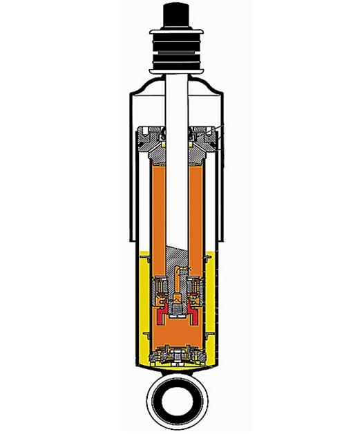 Гідравлічні двотрубні амортизатори - найпоширеніший і дешевий тип демпфіруючих стійок. Складається такий амортизатор з двох трубок: робочої колби, де і знаходиться поршень, і зовнішнього корпусу, призначеного для зберігання надлишкового мастила. Поршень переміщається у внутрішній колбі, пропускаючи мастило через власні канали і видавлюючи частину мастила через клапан, що знаходиться внизу колби. Цей клапан іноді називають клапаном стиску, оскільки часто він відповідає за перетікання мастила саме в даному такті. Ця частина рідини просочується в порожнину між колбою і зовнішнім корпусом, де стискує повітря, що знаходиться при атмосферному тиску у верхній частині амортизатора. При русі назад починають діяти клапани самого поршня, регулюючи зусилля на відбій.