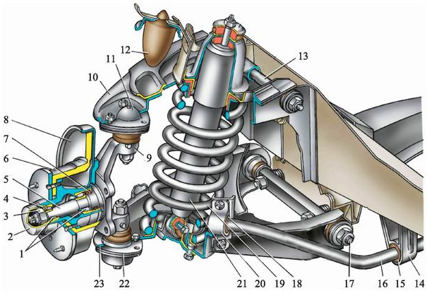 Рис.7 – Деталі передньої підвіски ВАЗ: 1 підшипники маточини переднього колеса; 2 -ковпак маточини; 3 - регулювальна гайка, 4 – шайба; 5 – цапфа поворотного пальця; 6 -маточина колеса; 7 - сальник; 8 – гальмівний диск, 9 - поворотний кулак; 10 - верхній важільпідвіски; 11 – корпус підшипника верхньої опори;12 - буфер ходу стиску; 13 – вісь верхнього важіля підвіски; 14 - кронштейн кріпленняштанги стабілізатора; 15 - подушка штанги стабілізатора; 16 - штанга стабілізатора; 17 -вісь нижнього важеля; 18 - подушка штанги стабілізатора; 19 - пружина підвіски; 20 – обойма кріплення штанги амортизатора; 21 -амортизатор, 22 – корпус підшипника нижньої опори, 23 - нижній важіль підвіски.