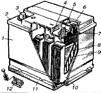 Акумуляторна батарея має поліпропіленовий напівпрозорий корпус 1 (рис. 3), розділений перегородками на шість відсіків, що представляють собою окремі акумулятори. Зверху акумулятори закриті загальною поліпропіленовою кришкою 2, привареною до корпуса ультразвуковим зварюванням. В кришці є отвори для заливання електроліту в кожен акумулятор і для проходу двох полюсних виводів батареї (плюсового і мінусового).