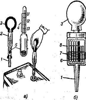 Рис. 29. Прилади для визначення густини електроліту: а — ареометр; б —густиномір; 1 — трубка для забору електроліту; 2 — скляна колба; 3 — гумова груша; 4 — шкала денсиметра; 5 — денсиметр; б — поплавок; 7 — шкала на корпусі густиноміра; 8 – прозорий пластмасовий корпус
